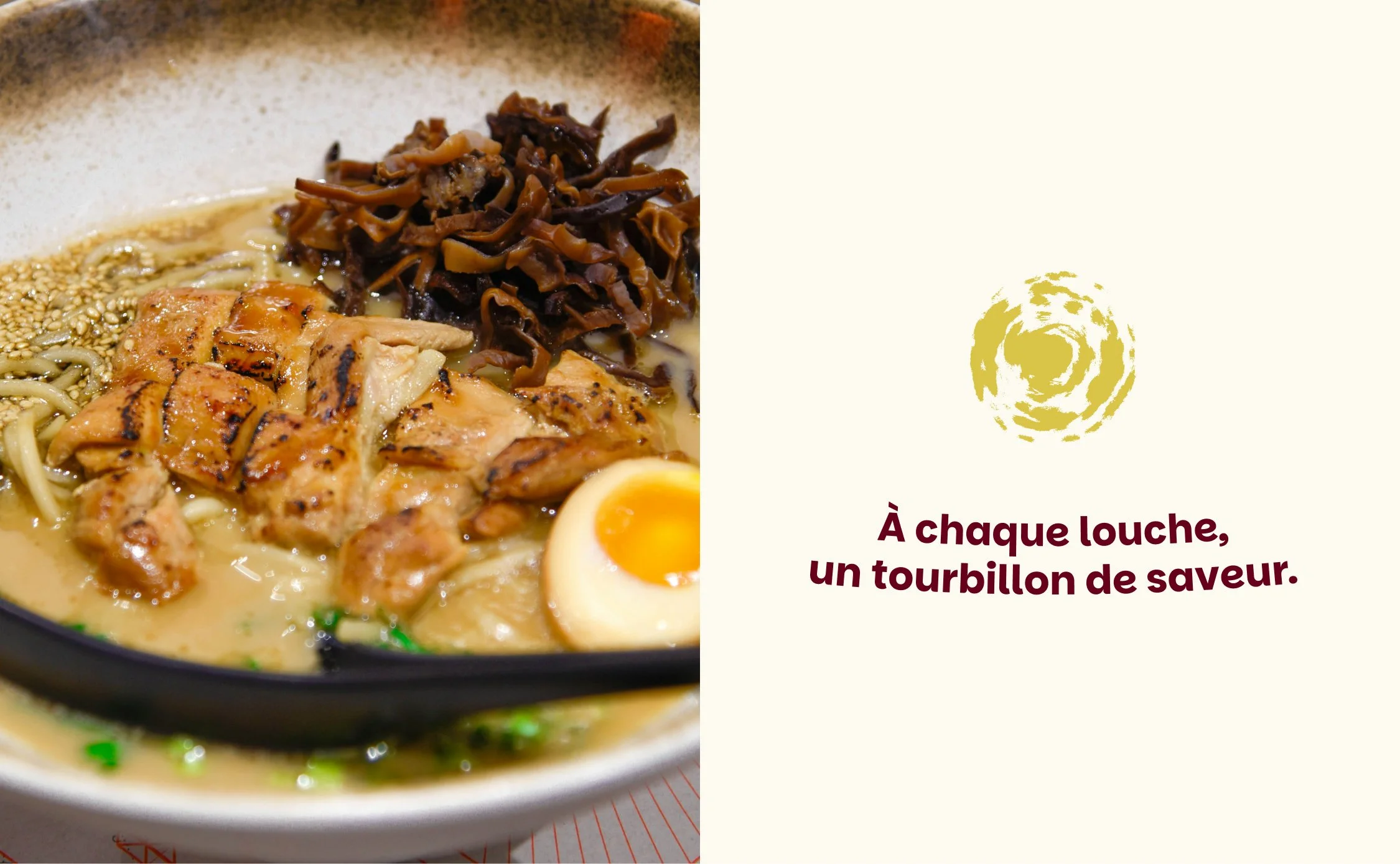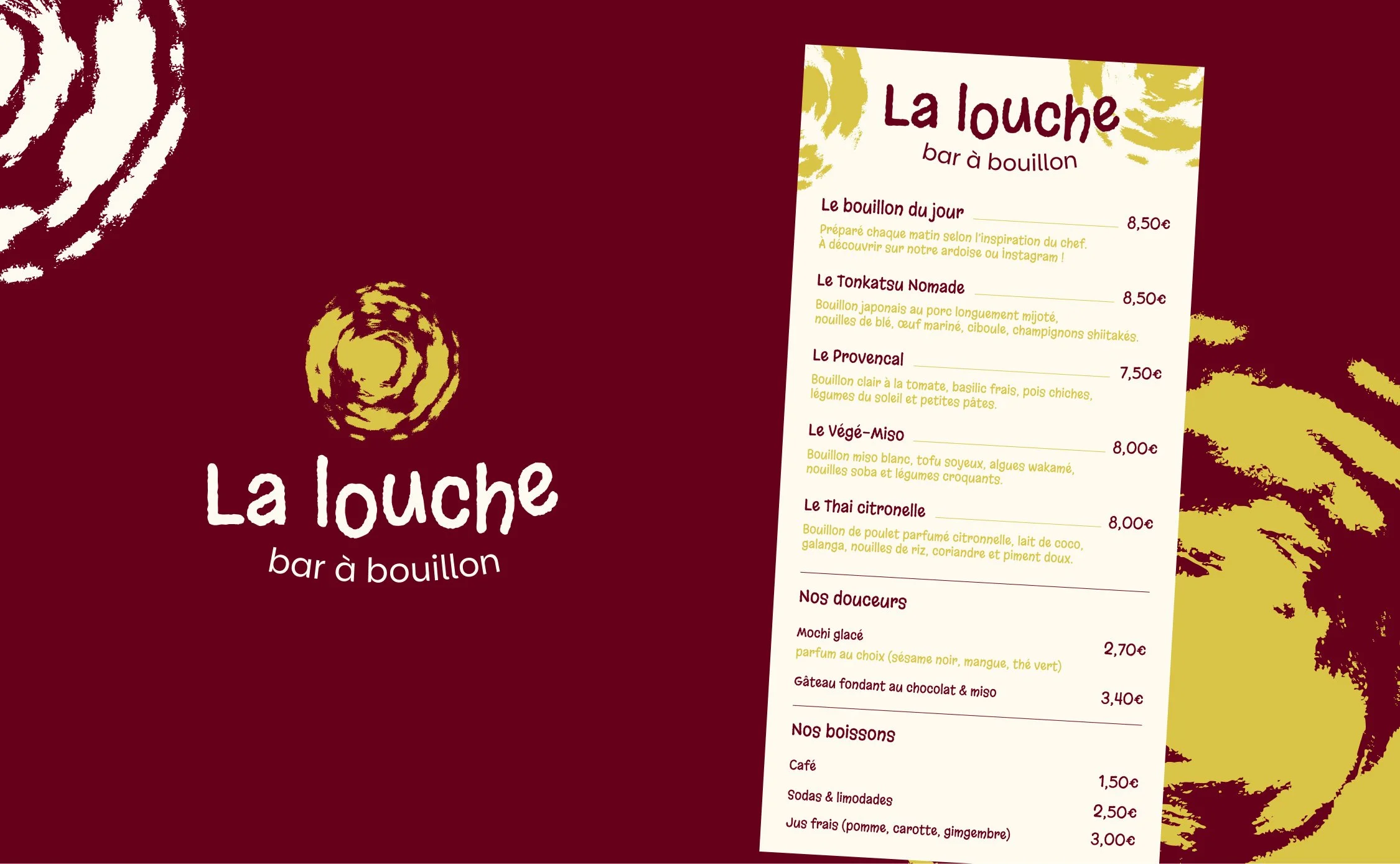 Pour ce nouveau défi proposé par @lesbriefscreatifs, j’ai imaginé l’univers graphique de La Louche, un bar à bouillons nomade et réconfortant. Mon concept s’articule autour d’un tourbillon de saveurs : un logo circulaire, tout en mouvement, inspiré du geste de mélanger son bouillon – ce moment simple où les arômes se révèlent et éveillent les sens.Cette dynamique visuelle incarne la chaleur, la convivialité et le plaisir sensoriel de ce lieu hybride, entre coffeeshop et restaurant artisanale.