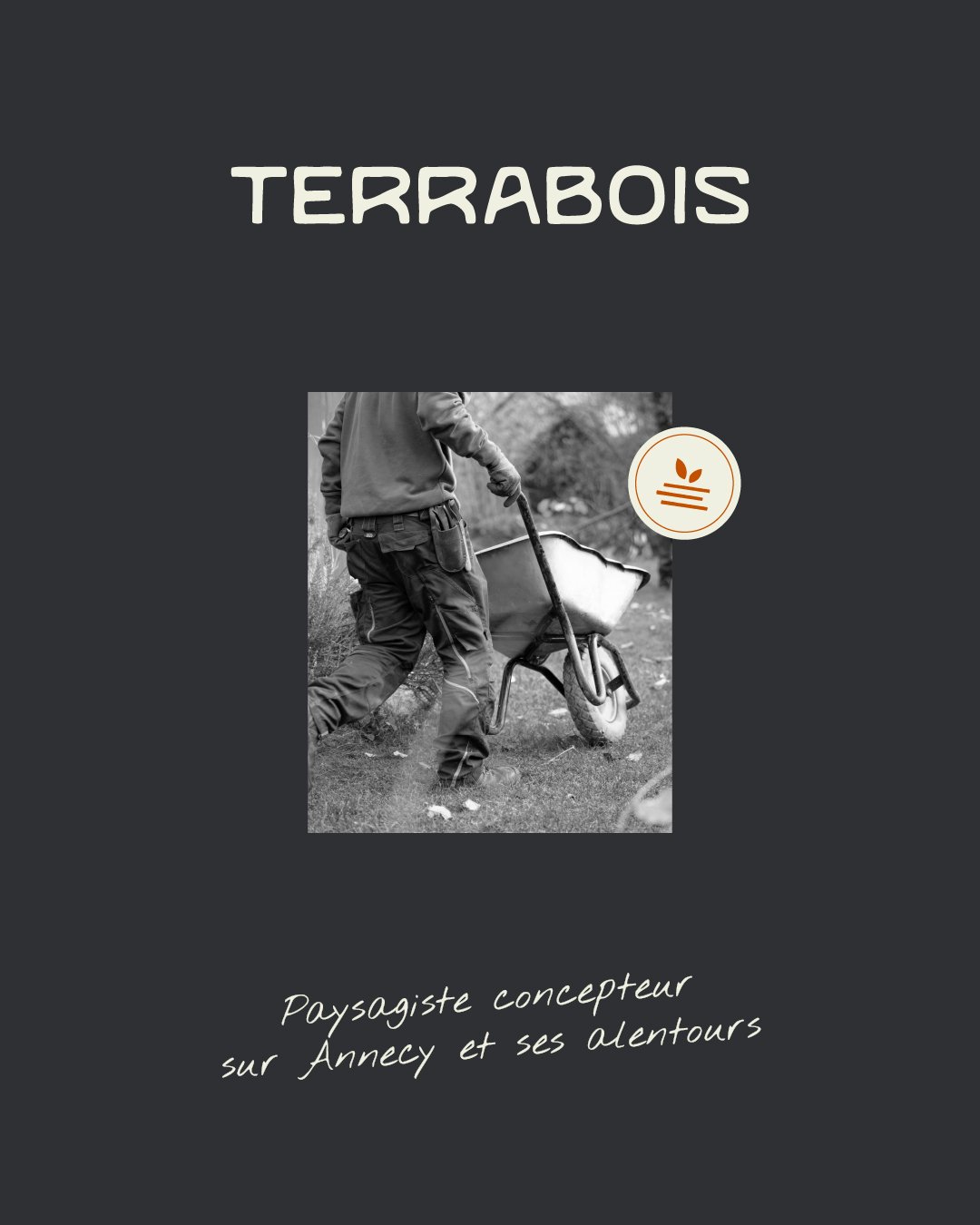 L’identité visuelle de TerraBois s’inspire directement de l’art du paysage : une composition végétale où chaque élément trouve naturellement sa place. À l’image d’un jardin pensé avec soin, le logo associe formes et textures pour créer un ensemble équilibré, harmonieux et vivant. Les éléments graphiques évoquent les tracés d’un plan paysager et la diversité des matières travaillées (bois, pierre, végétaux). La typographie, organique et structurée, traduit la maîtrise et le savoir-faire artisanal.